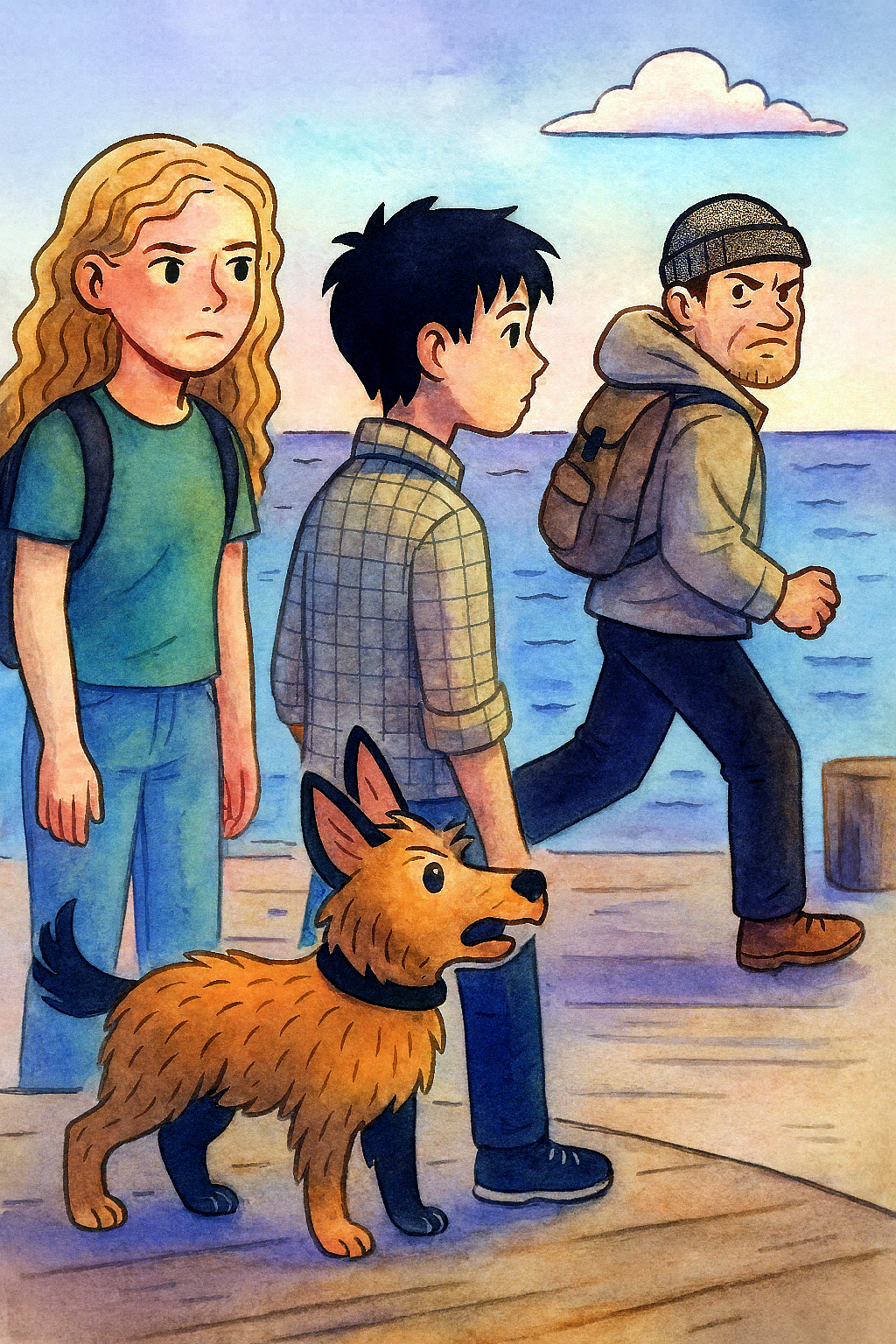 Die folgenden Illustrationen stammen aus den wichtigsten Szenen des Kinderbuchs „Rubinka & Fritz – Sommer voller Abenteuer“. Sie zeigen Rubinka, Fritz und Dackel Axel auf ihrer abenteuerlichen Spurensuche an der Ostsee – immer zwischen Alltag und Entdeckung, Freundschaft und Mut.